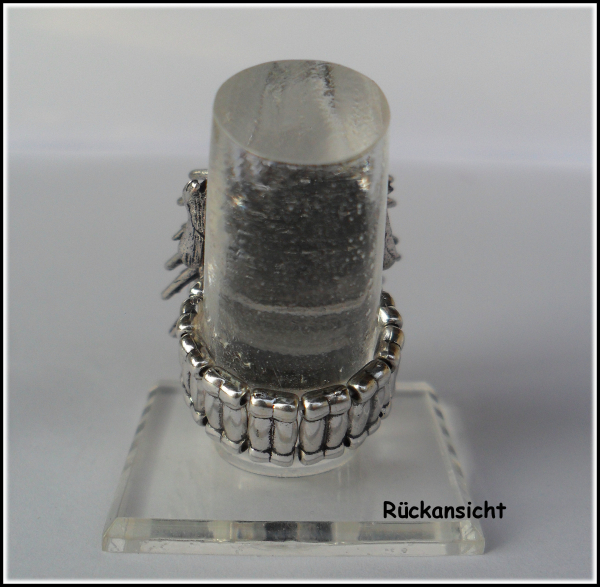 Der Ring hat eine Dehnschiene, das heißt die Ringschiene besteht aus Metallperlen, die auf ein Gummiband gezogen sind. Bequem passt er für die Größe 18 und 19.
