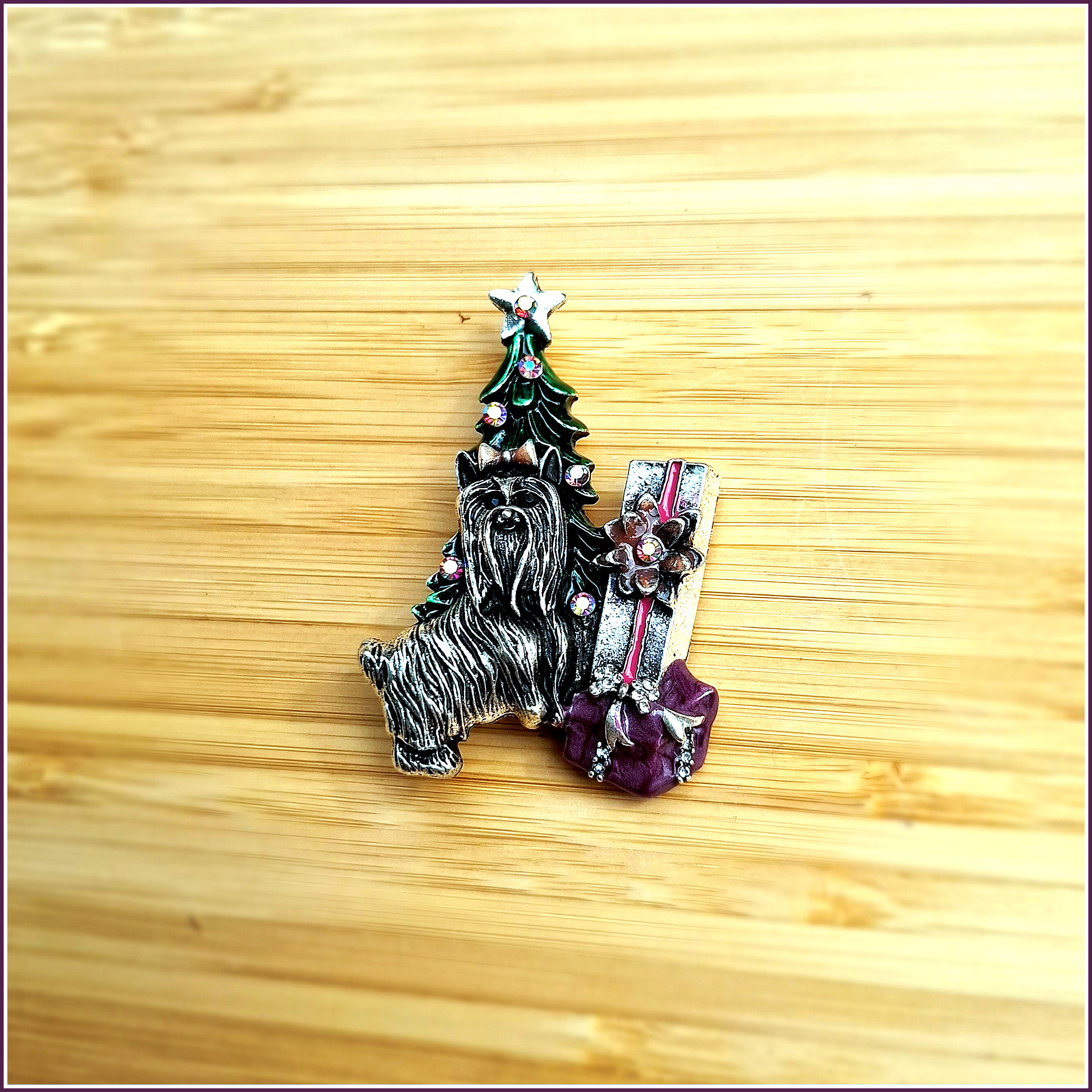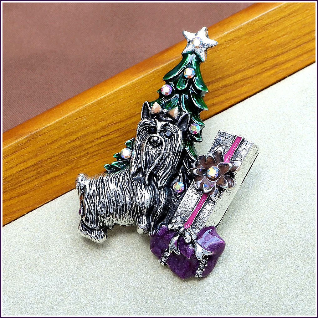 Ein niedlicher Hund – wir sehen einen Yorkshire Terrier, können uns aber auch irren – sitzt hier neben großen Geschenken unter einem Weihnachtsbaum.