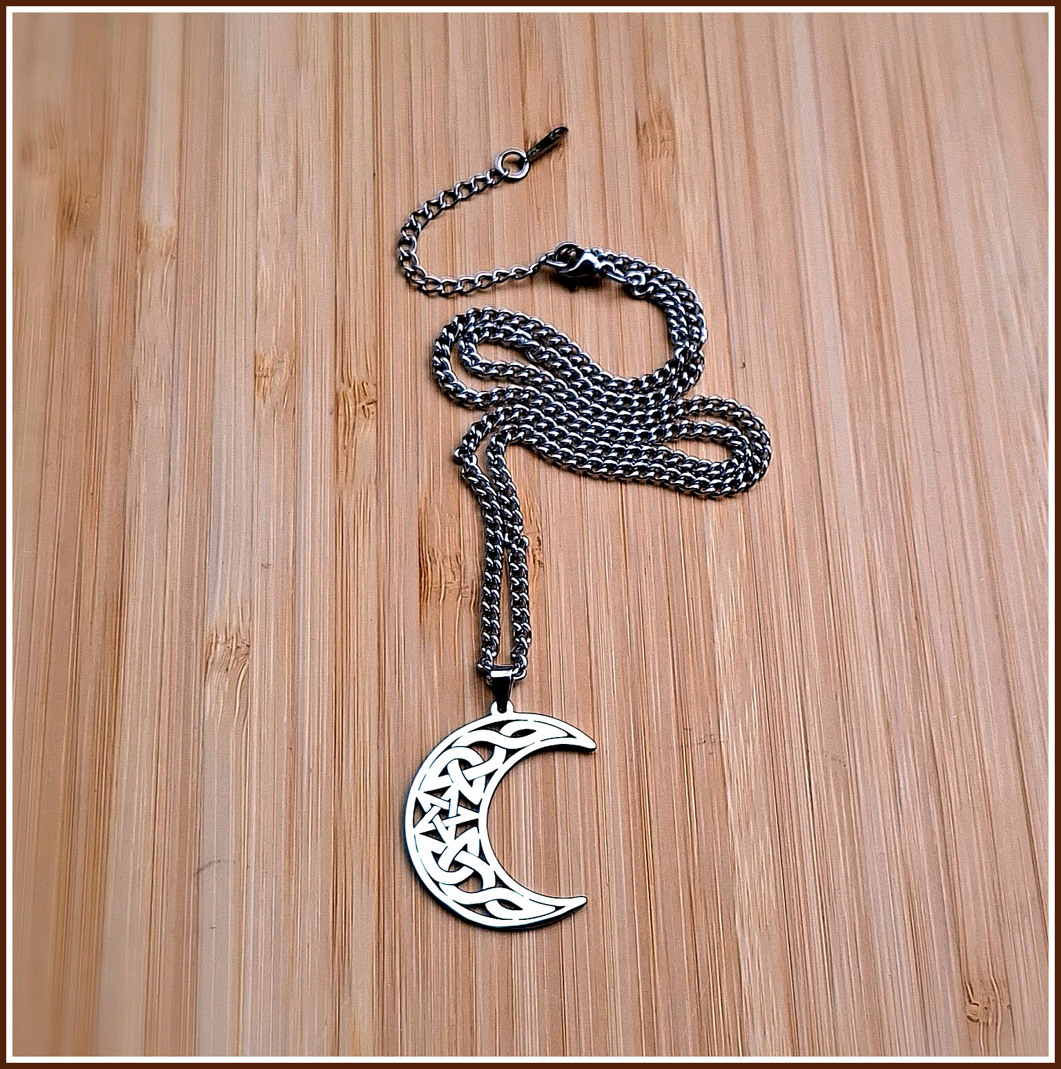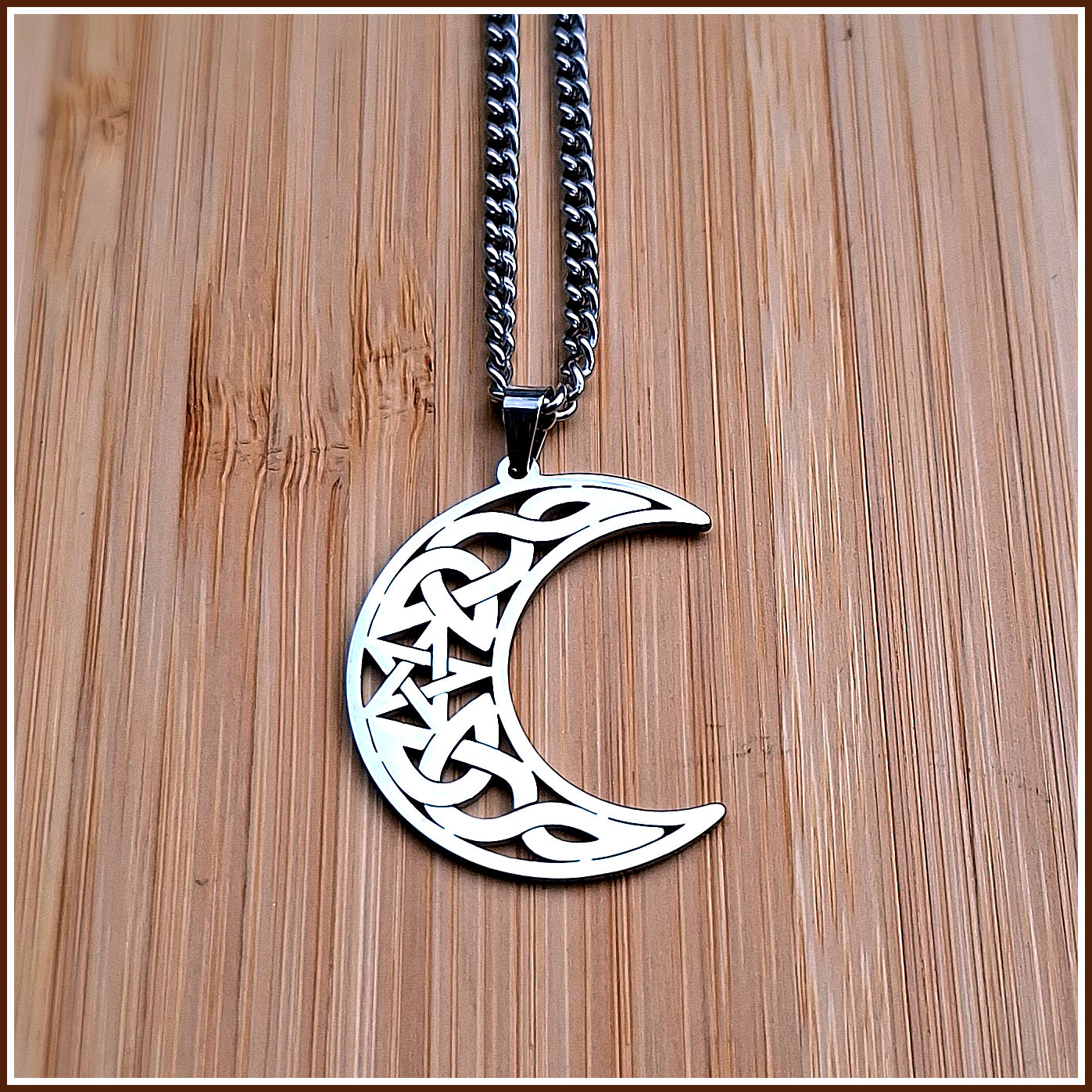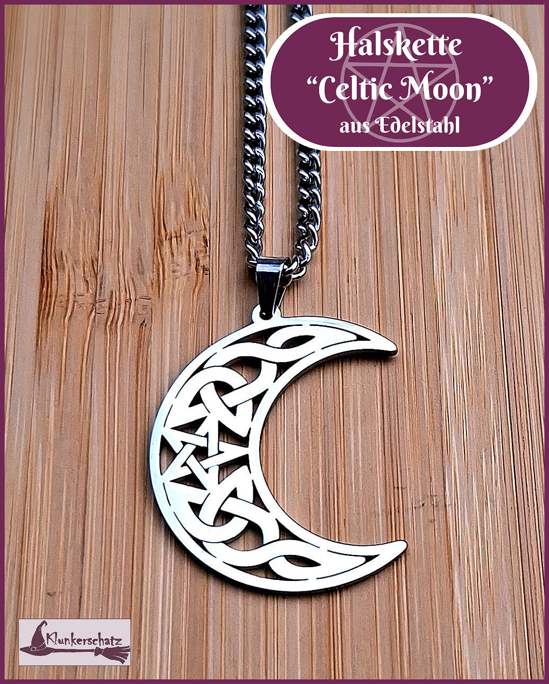 Im Zentrum dieser wunderschönen keltischen Mondsichel befindet sich ein Pentagramm, umgeben von keltischen Knoten.